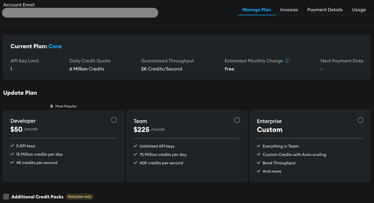 If upgrading from the Core (free) plan, you'll need to add your payment details.